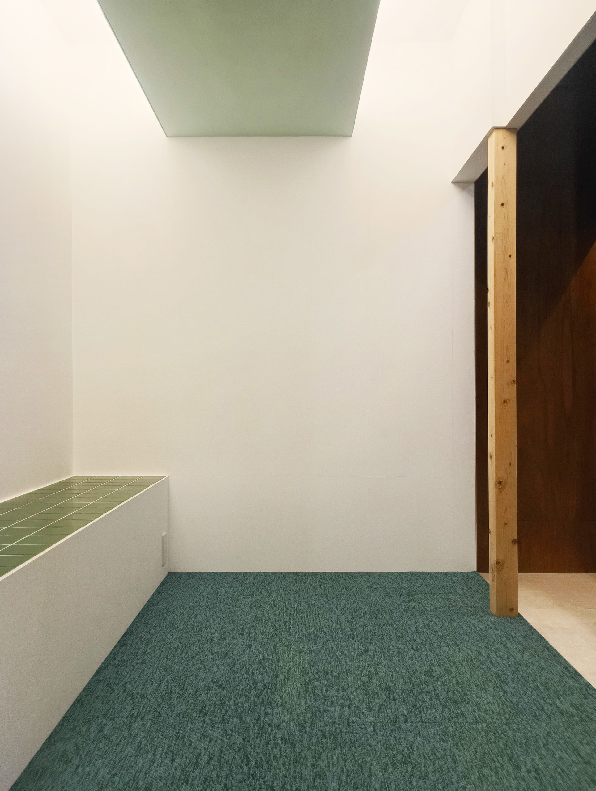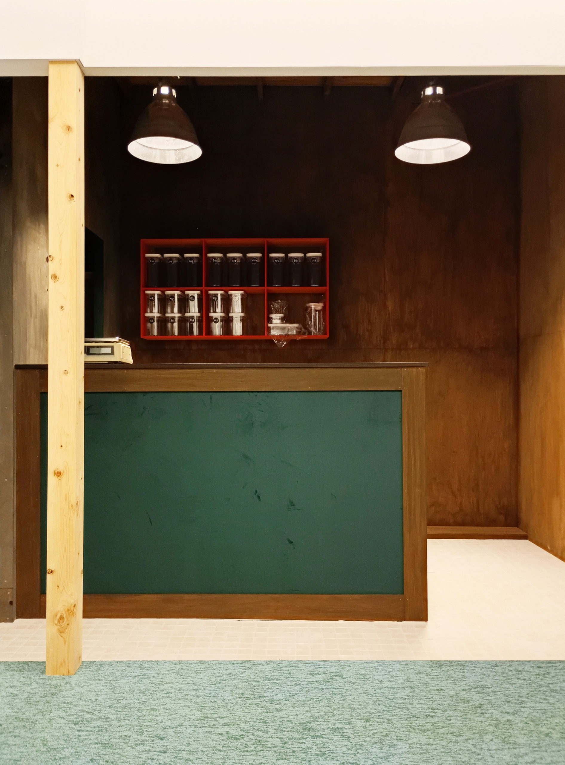 クライアントと話す中で、様々な側面からこの店舗のイメージとして「緑」が強く浮かんだ。そこで、タイル・カーペット・布・塗装などさまざまな素材の「緑」を組み込んだ。